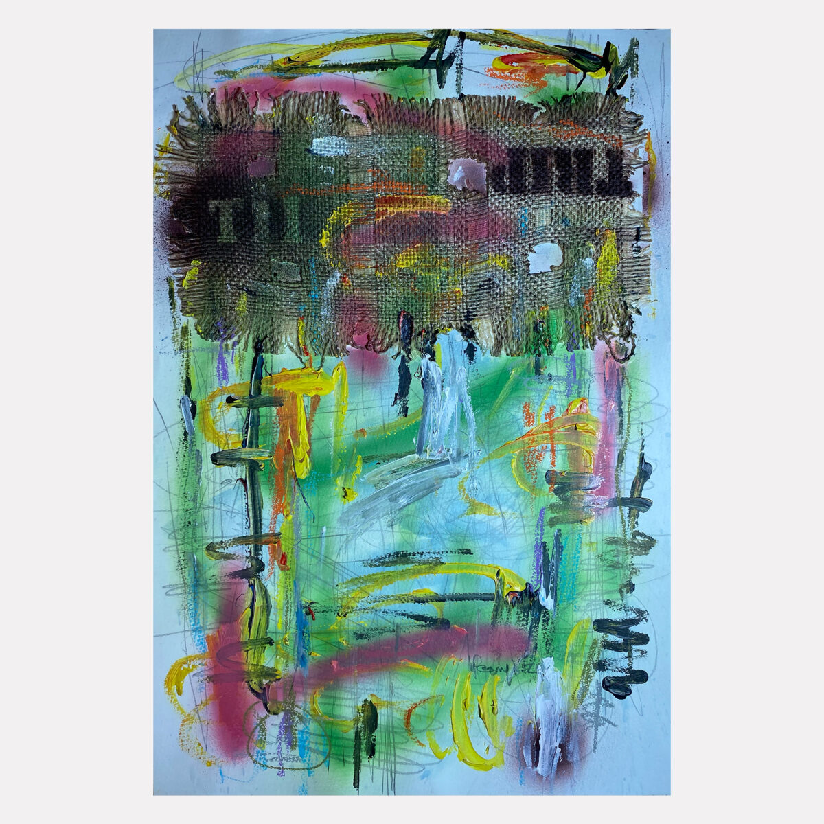 Working primarily with jute sacks, thread, rope, spray paint, and found organic materials, Uzuegbunam approaches material as both medium and archive. Jute sacks—objects embedded in systems of labour, trade, and circulation—function in his practice as carriers of memory and informal records of human experience. Through processes of stitching, patching, layering, printing, and erasure, he transforms these surfaces into sites of inscription informed by Nsibidi-inspired codes, symbolic markings, and fragmented forms. His practice is guided by the concept of enigma as a method of inquiry, embracing ambiguity and fragility as productive spaces for research. Oscillating between abstraction and figuration, rupture and repair, his work investigates materiality, identity, consumerism, and humanism. By foregrounding process, Uzuegbunam positions the studio as a site of research and knowledge production, where making becomes a form of archiving.