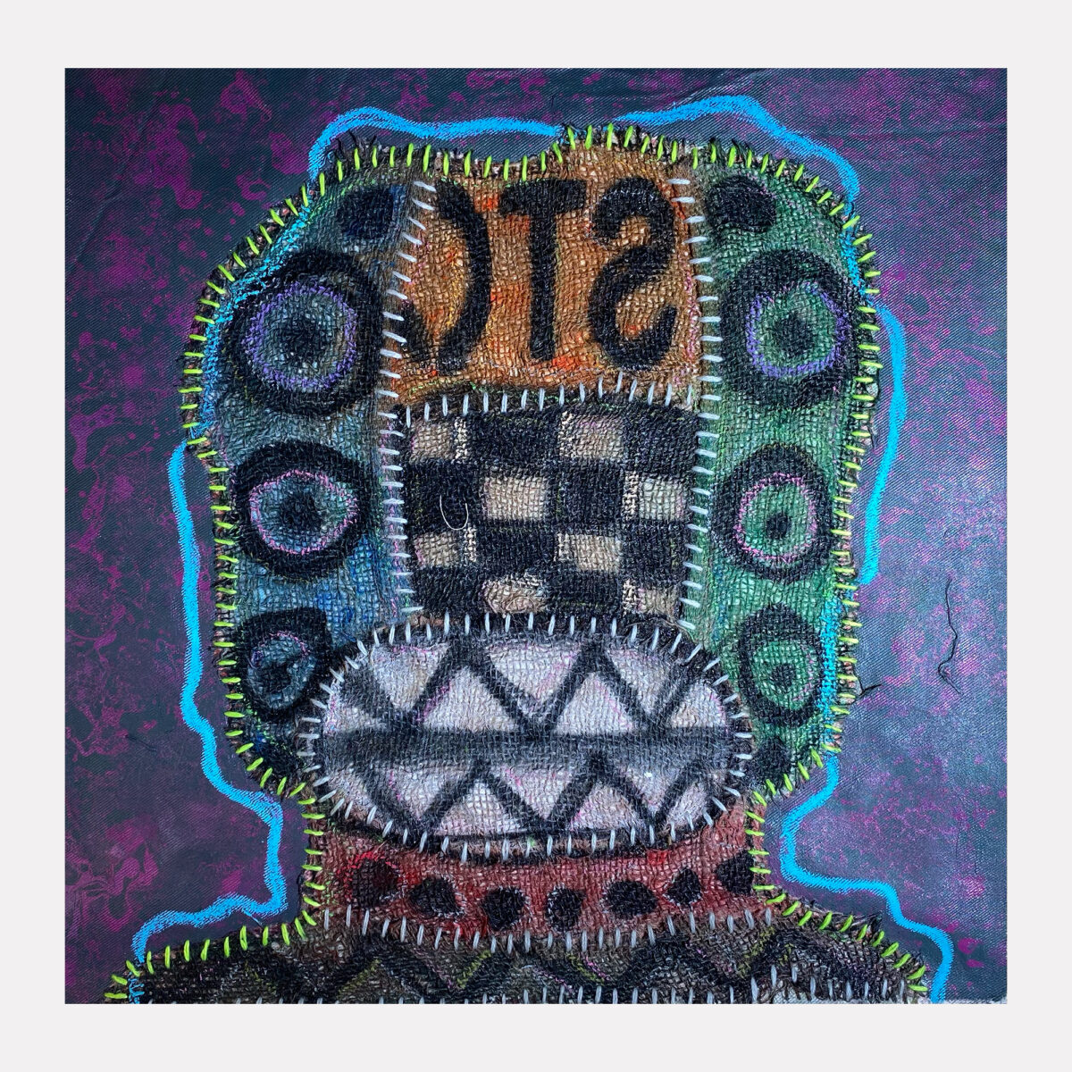 Working primarily with jute sacks, thread, rope, spray paint, and found organic materials, Uzuegbunam approaches material as both medium and archive. Jute sacks—objects embedded in systems of labour, trade, and circulation—function in his practice as carriers of memory and informal records of human experience. Through processes of stitching, patching, layering, printing, and erasure, he transforms these surfaces into sites of inscription informed by Nsibidi-inspired codes, symbolic markings, and fragmented forms. His practice is guided by the concept of enigma as a method of inquiry, embracing ambiguity and fragility as productive spaces for research. Oscillating between abstraction and figuration, rupture and repair, his work investigates materiality, identity, consumerism, and humanism. By foregrounding process, Uzuegbunam positions the studio as a site of research and knowledge production, where making becomes a form of archiving.