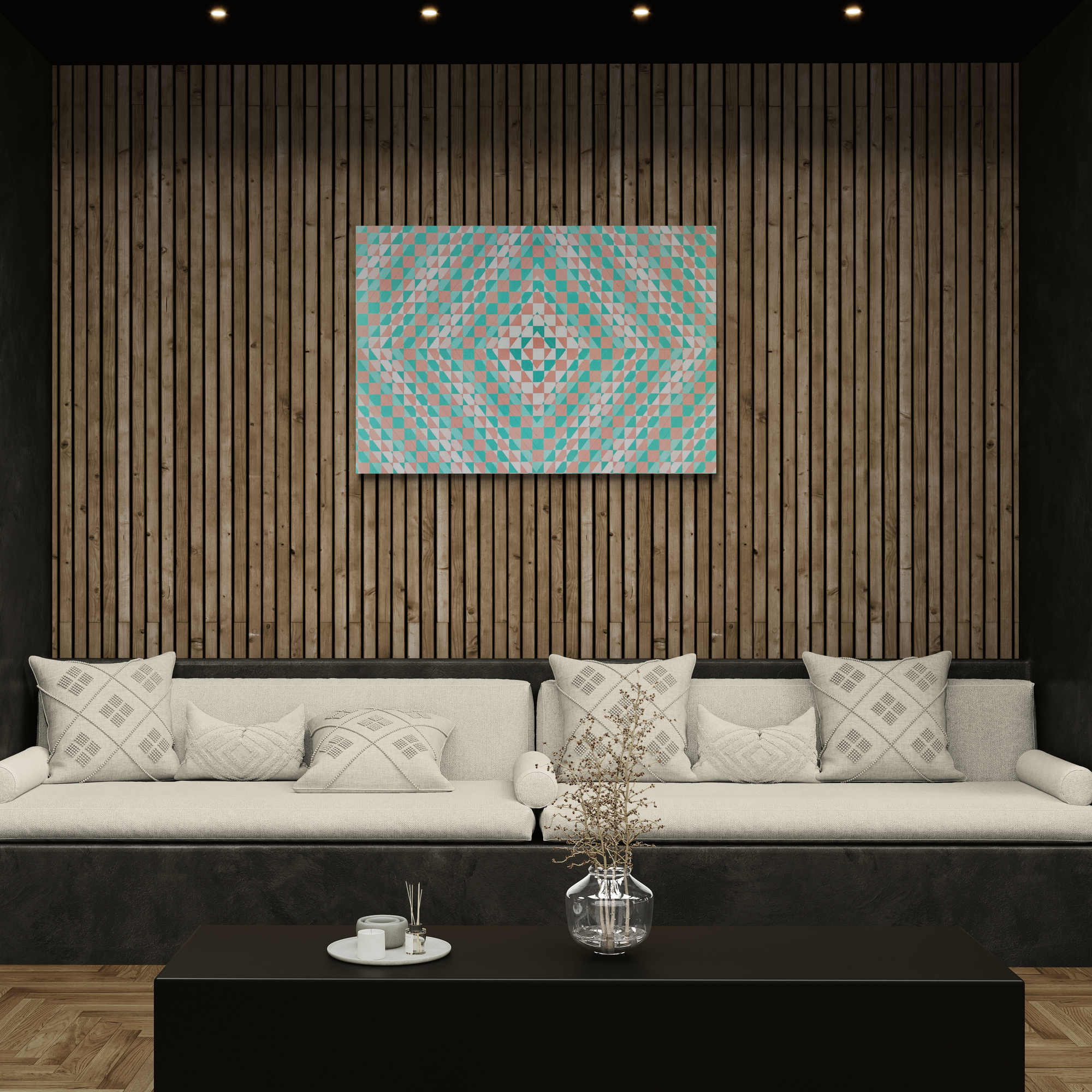 Her work is included in permanent collections at Dwight Englewood School, New York, and Arizona. Drawing from her background in graphic design, her technical mastery of painting, and a deep fascination with geometry and mosaic art, her work offers a unique perspective where the grid becomes a portal to a symphony of motion, weaving dimensions.