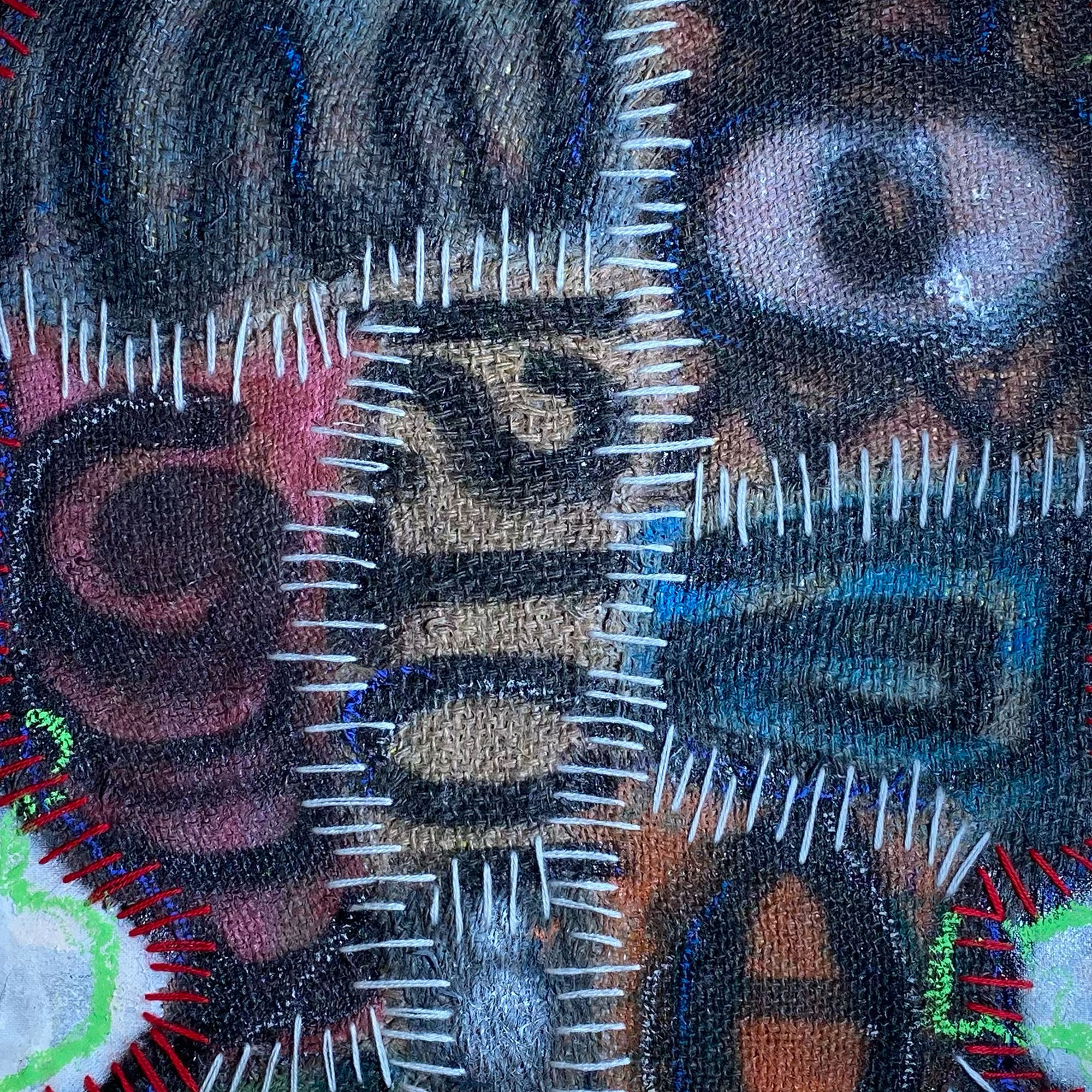 Working primarily with jute sacks, thread, rope, spray paint, and found organic materials, Uzuegbunam approaches material as both medium and archive. Jute sacks—objects embedded in systems of labour, trade, and circulation—function in his practice as carriers of memory and informal records of human experience. Through processes of stitching, patching, layering, printing, and erasure, he transforms these surfaces into sites of inscription informed by Nsibidi-inspired codes, symbolic markings, and fragmented forms.