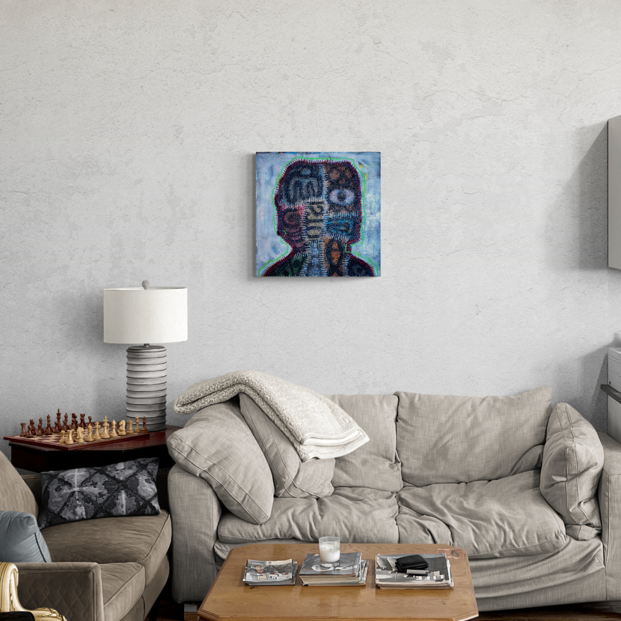 Working primarily with jute sacks, thread, rope, spray paint, and found organic materials, Uzuegbunam approaches material as both medium and archive. Jute sacks—objects embedded in systems of labour, trade, and circulation—function in his practice as carriers of memory and informal records of human experience. Through processes of stitching, patching, layering, printing, and erasure, he transforms these surfaces into sites of inscription informed by Nsibidi-inspired codes, symbolic markings, and fragmented forms. His practice is guided by the concept of enigma as a method of inquiry, embracing ambiguity and fragility as productive spaces for research. Oscillating between abstraction and figuration, rupture and repair, his work investigates materiality, identity, consumerism, and humanism. By foregrounding process, Uzuegbunam positions the studio as a site of research and knowledge production, where making becomes a form of archiving.